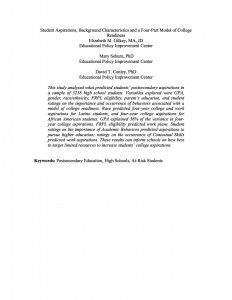 This study analyzed what predicted students’ postsecondary aspirations in a sample of 5258 high school students. Variables explored were GPA, gender, race/ethnicity, FRPL eligibility, parent’s education, and student ratings on the importance and occurrence of behaviors associated with a model…