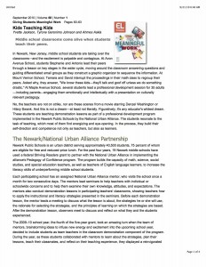 The article outlines an instructional practice occurring in Newark Public School district, wherein middle school students, under the instruction of teachers and National Urban Alliance mentors, guide the rest of their class through a lesson, assuming the role of primary…