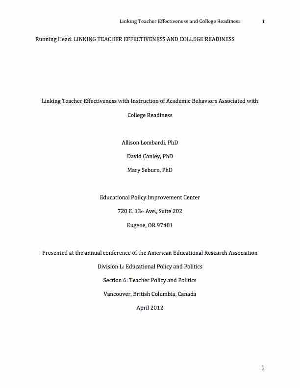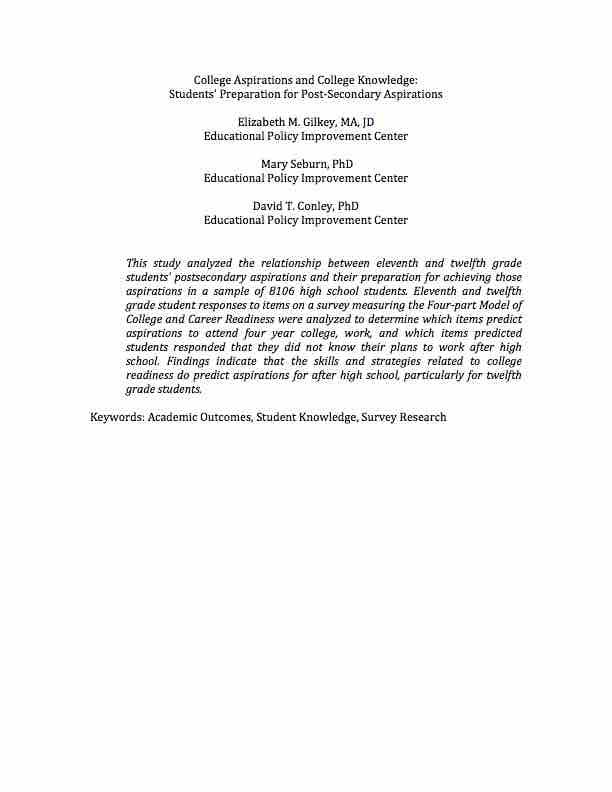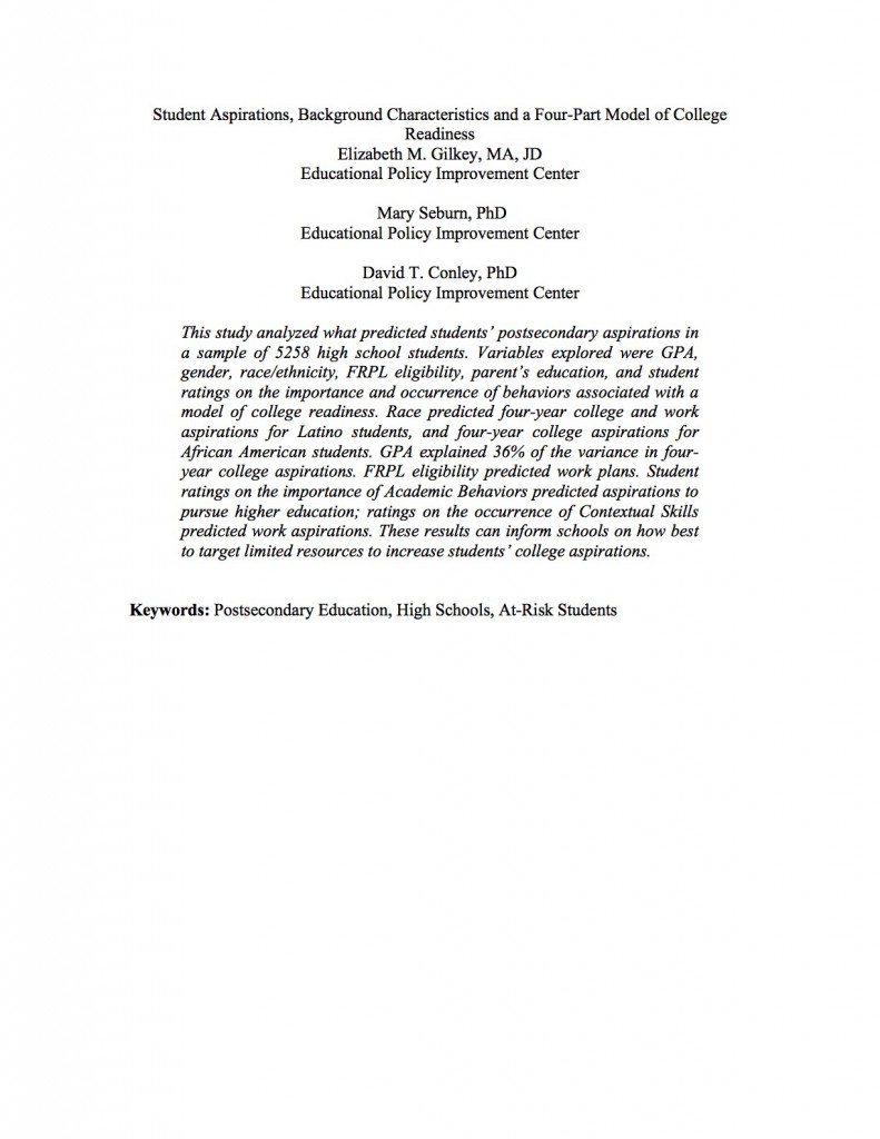 This study analyzed the relationship between eleventh and twelfth grade students’ postsecondary aspirations and their preparation for achieving those aspirations…